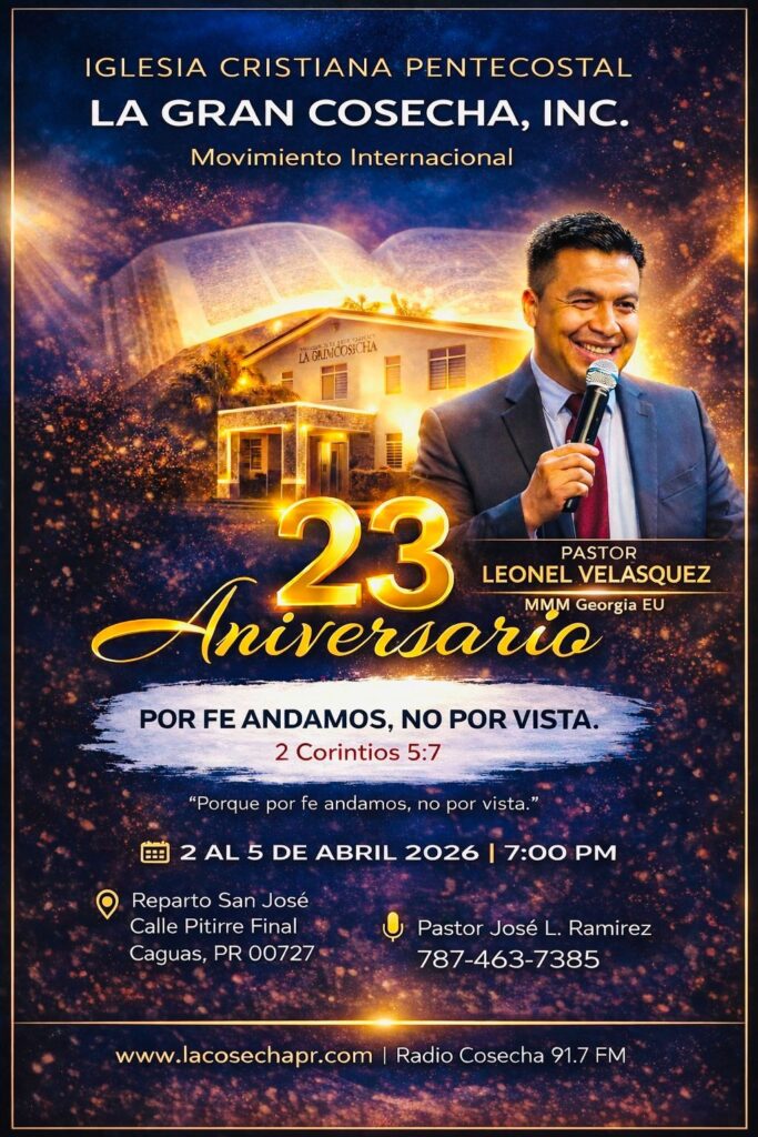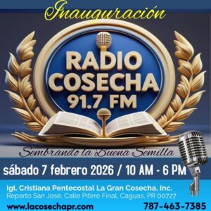 Dios le bendiga grandemente a todos los hermanos que están en sintonía a través del mundo, nos alegra tenerte con nosotros en este espacio donde la palabra de Dios llega con poder y esperanza. En La Cosecha PR, nuestra misión es llevar el mensaje transformador del evangelio a cada rincón del mundo, utilizando la radio como medio para alcanzar vidas, restaurar corazones y edificar la fe de todos nuestros oyentes. Esperamos ser de mucha edificación a sus vidas y de mucha bendición a través de nuestra emisora radial 91.7 FM y a través de nuestros cultos en vivo desde la iglesia.